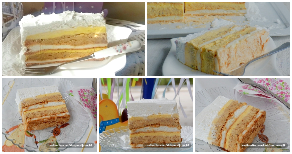 Japanski vetar Torte by admin31 - March 28, 20200 … Sastojci za koru 12 belanaca 400g kristal secera 1kasika sirceta za fil 12 zumanaca 12 kasika secera 1l mleka 3 Pudinga vanilin Dolcela 150g oraha 150g plazme 1 margarin za ukrasavanje 1/2l slatke pavlake Priprema 1. Za koru: Belanca najbolje da vam odstoje na sobnoj temperaturi 3,4 sata pre mucenja ili jaja ostavite van frizidera da prenoce.Bitno da ne budu hladna. Rernu zagrejte na 250 stepeni. Umutiti dobro belanca,kada su umucena lagano dodavati secer svo vreme muteci,mora da bude jako cvrst sneg. Pred kraj dodajte kasiku sirceta i jos mutite. Veliki pleh od sporeta premazite margarinom ,stavite pek papir i opet premazite margarinom. Izrucite umucena belanca i poravnajte. Stavite u rernu i temperaturu odmah smanjite na 150 stepeni. Susite koru sat vremena pa smanjite na 100 stepeni i susite jos pola sata. Otvorite rernu i ostavite koru u rerni dok se rerna potpuno ne ohladi i kora u njoj. (ja to nekad radim uvece,pa ostavim koruz preko noci u rerni,bude odlicna,jos bolja;) ) 2. Za fil: Stavite da se kuva 8dl mleka sa secerom. Zumanca umutite,dodajte ostatak mleka,puding i kad mleko prokuva,sklonite sa vatre dodajte polako zumanca sa pudingom svo vreme muteci zicom da se ne stvore grudvice. Vratite na tihu vatru i mesajte zicom dok se ne zgusne. Ostavite da se ohladi. 3. Margarin penasto umutite pa dodajte ohladjenom filu. Fil podelite na 2 dela,jedan ostavite zut,a drugom dodajte mleveni keks i orahe. Koru presecite na pola,tako da dobijete 2 kore. Filujte:Kora+ fil sa keksom i orasima+zuti fil+kora+fil sa keksom i orasima+zuti fil i odgore umucena slatka pavlaka.